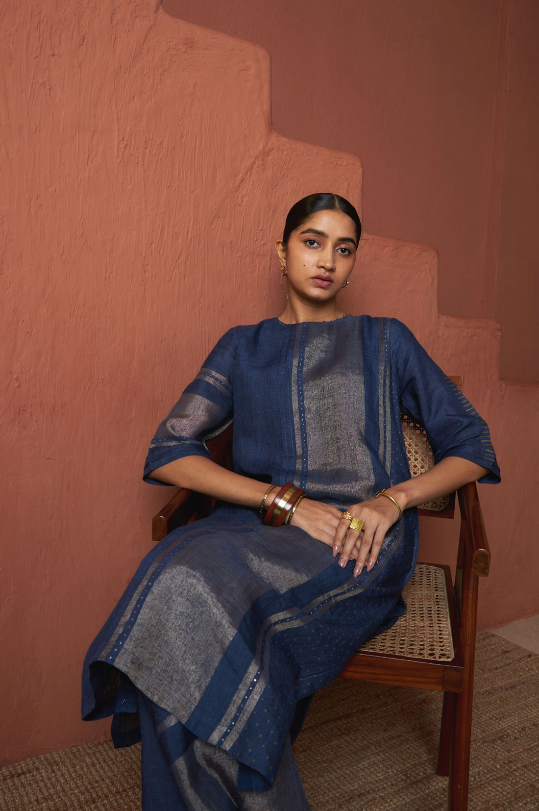 This timeless indigo kurta set from our Jashn collection has been crafted with metallic-woven panels...