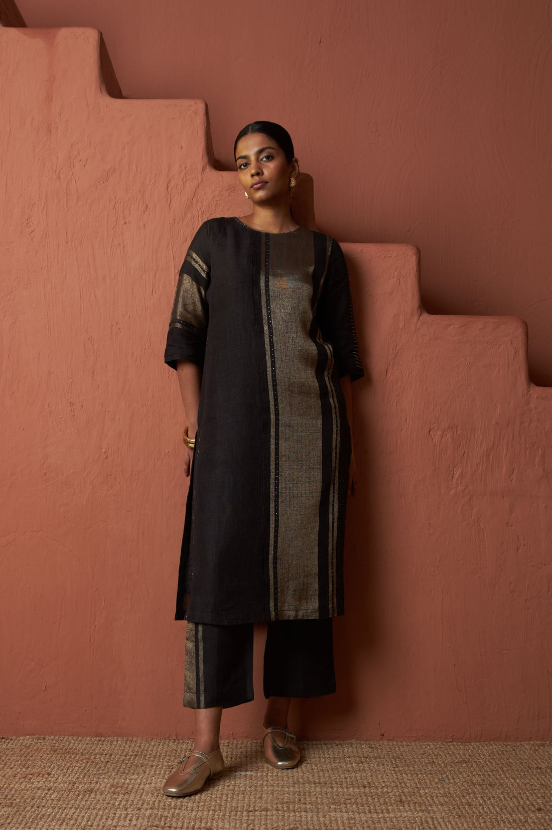 This timeless black kurta set from our Jashn collection has been crafted with metallic-woven panels...