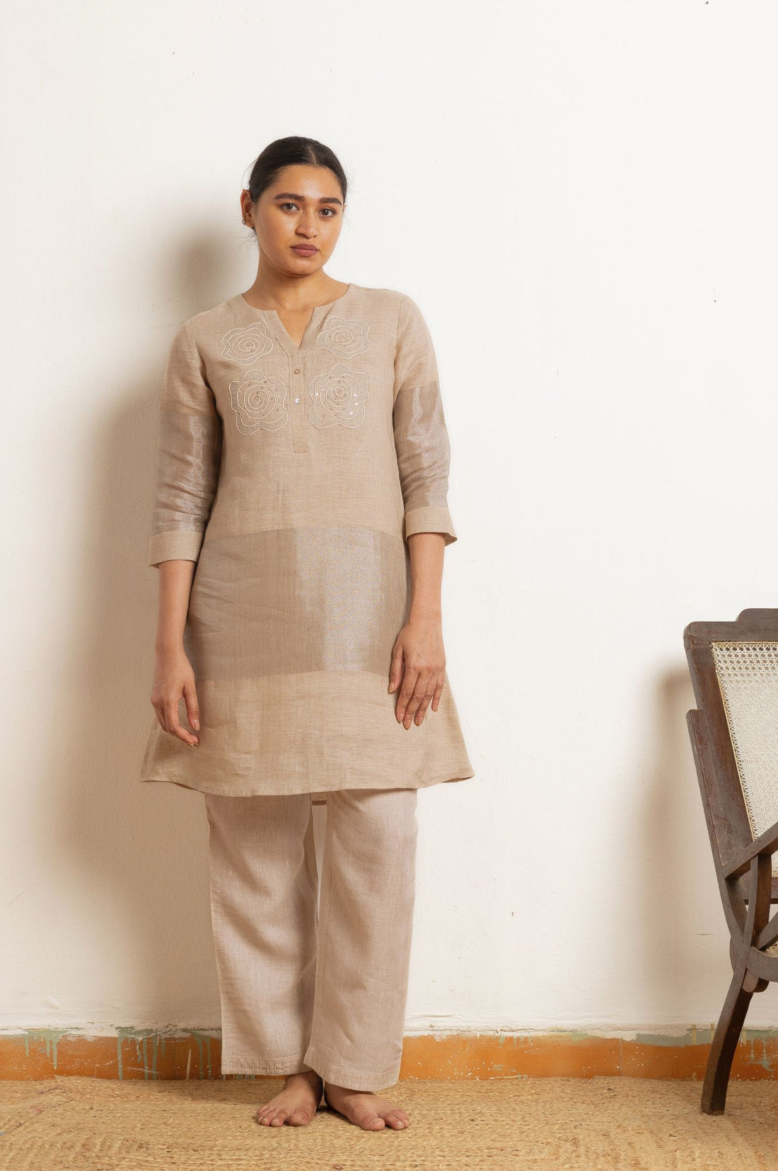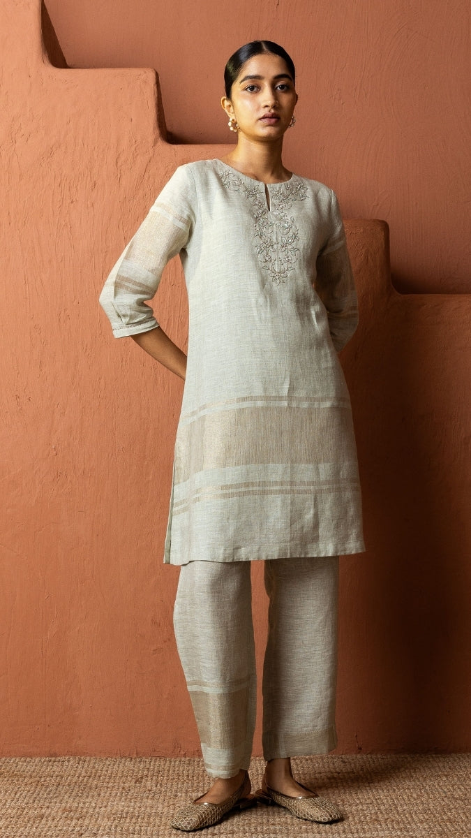 Beige Linen Zari Set