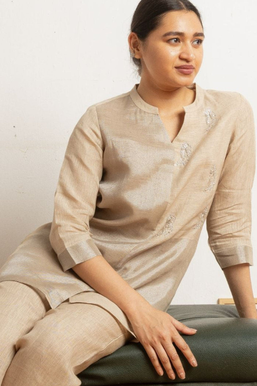 In a palette of muted coffee , this 100% linen Kurta sets from our Noor...