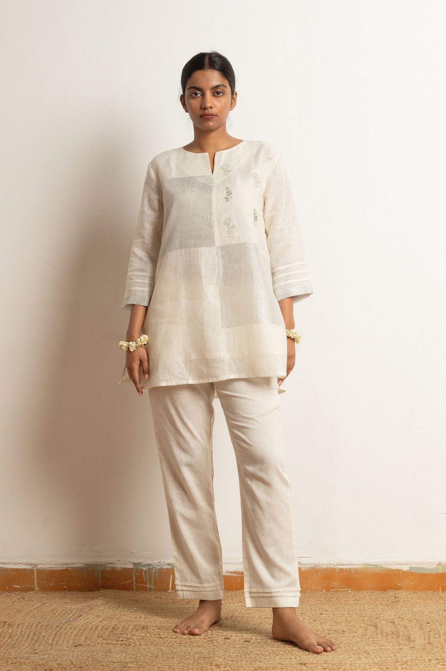 A structured top crafted in a soft placement 100% pure woven zari linen. Finished with beautiful intricate hand thread embroidery that makes it perfect for any of the dressy occasions and brings alive that celebrates texture as well as craft, with modern ease.