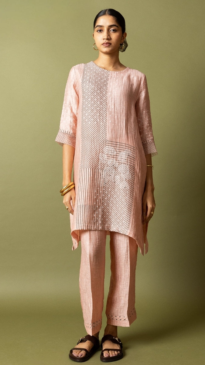 For the woman who embraces color with confidence, this lime linen Kurta set from our leher collection features minimalistic geometric hand-block prints reimagined for a contemporary aesthetic. Intricate embroidery enriches the artisanal motifs, creating a distinguished piece defined by vibrant character and impeccable craftsmanship.
