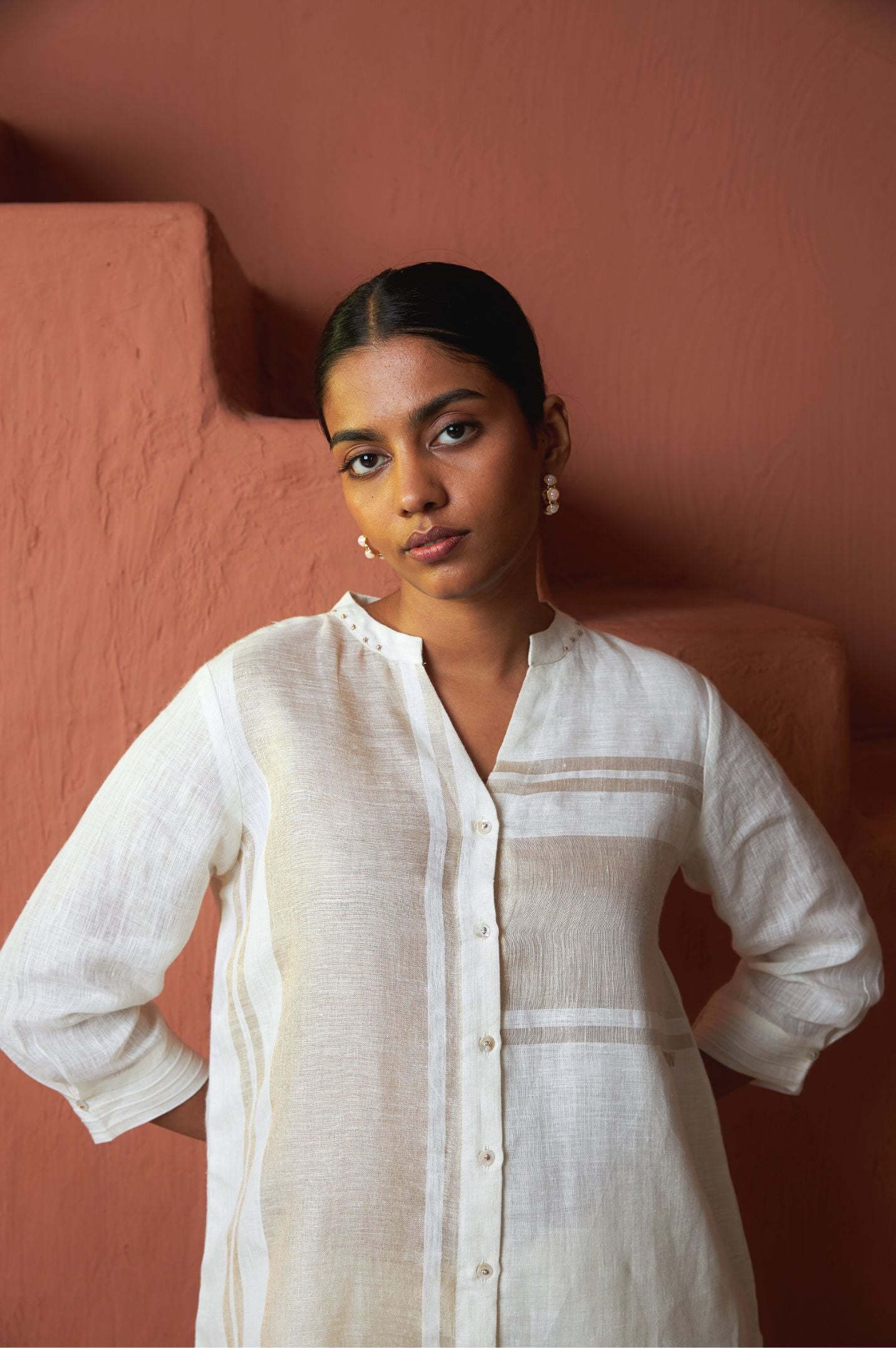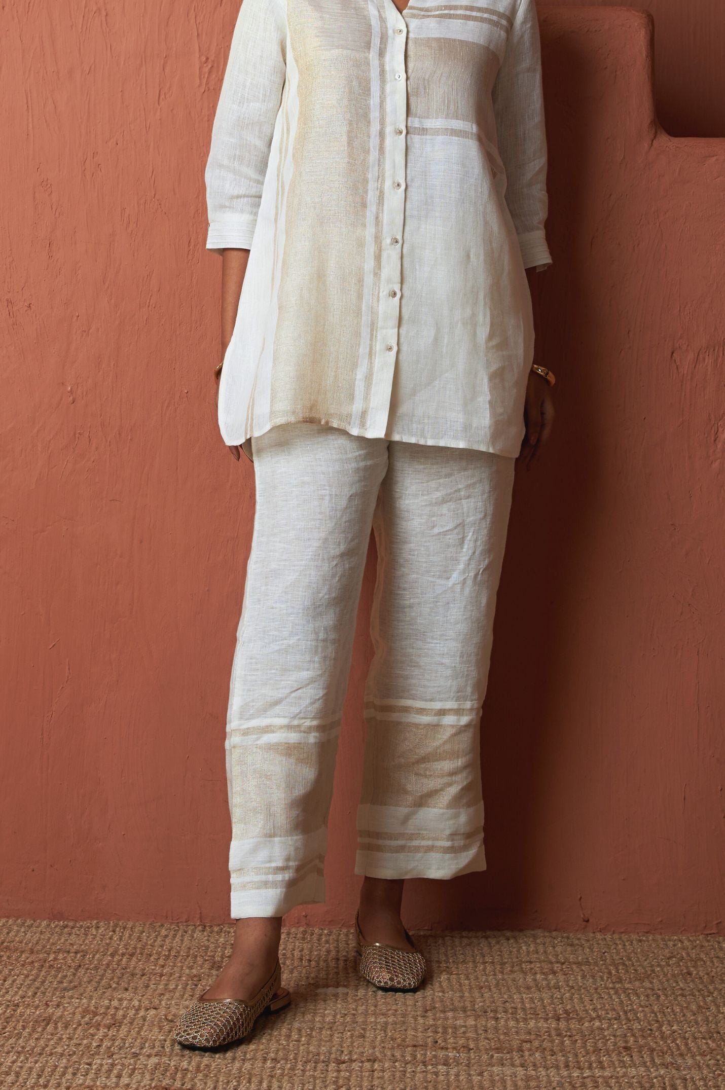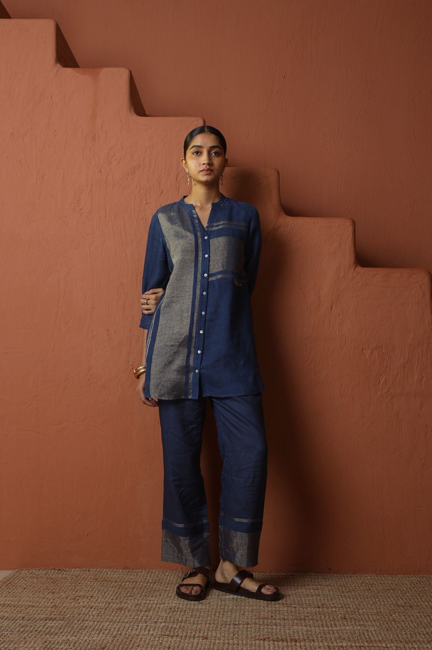 In deep indigo linen, this co-ord from Jashn collection carries the richness of heritage with its woven zari detailing. A piece that balances depth and delicacy, crafted for women who appreciate artful, effortless luxury.