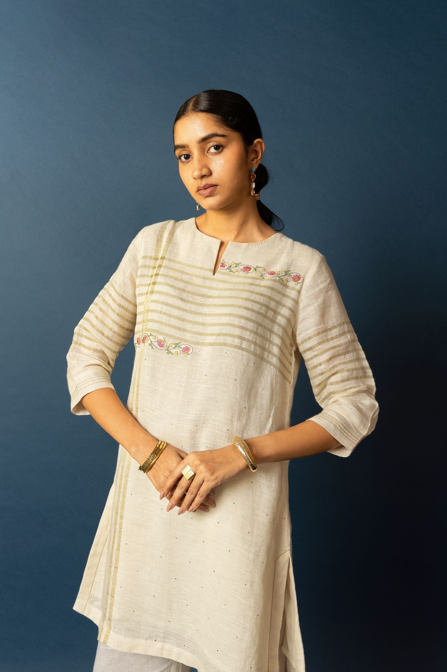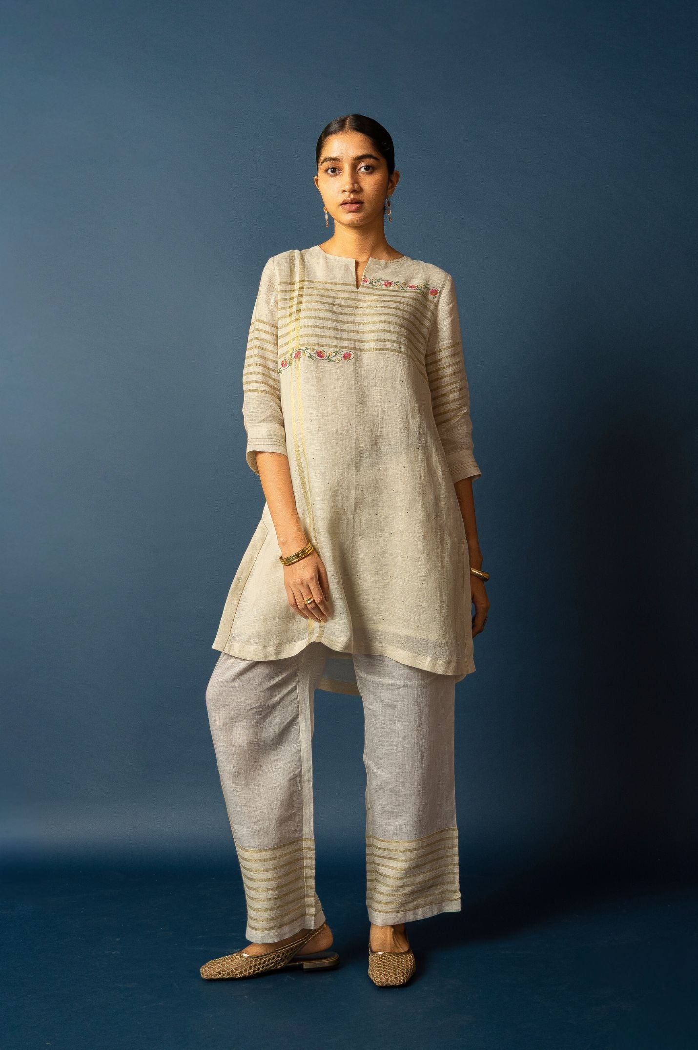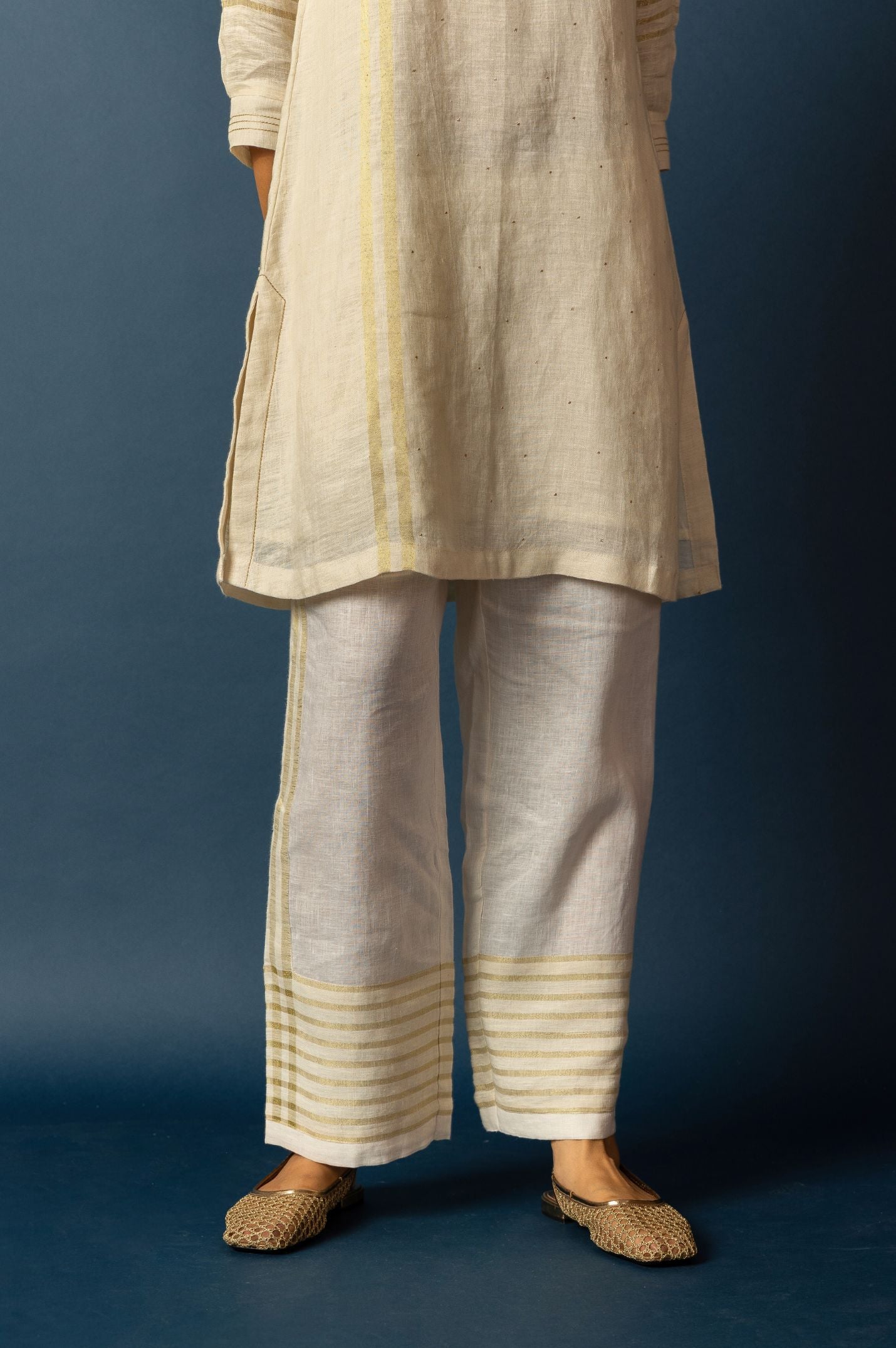 A timeless kurta set crafted in 100% pure linen, elevated with subtle woven gold zari accents for effortless elegance.
