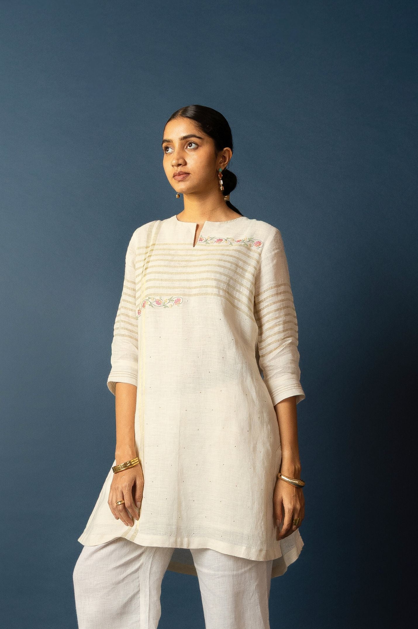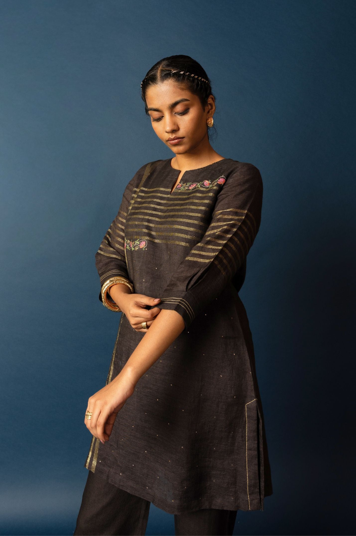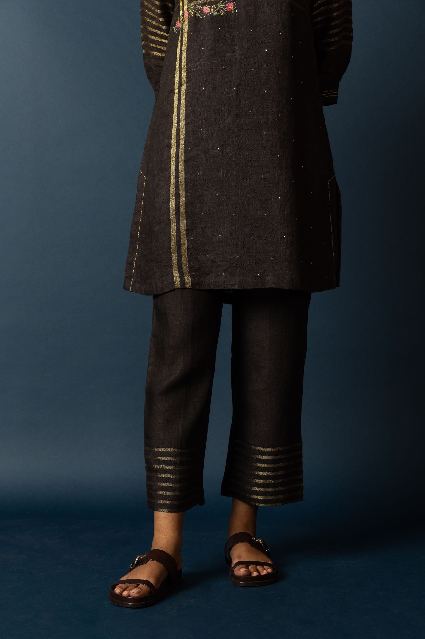 A timeless kurta set crafted in 100% pure linen, elevated with subtle woven gold zari accents for effortless elegance.