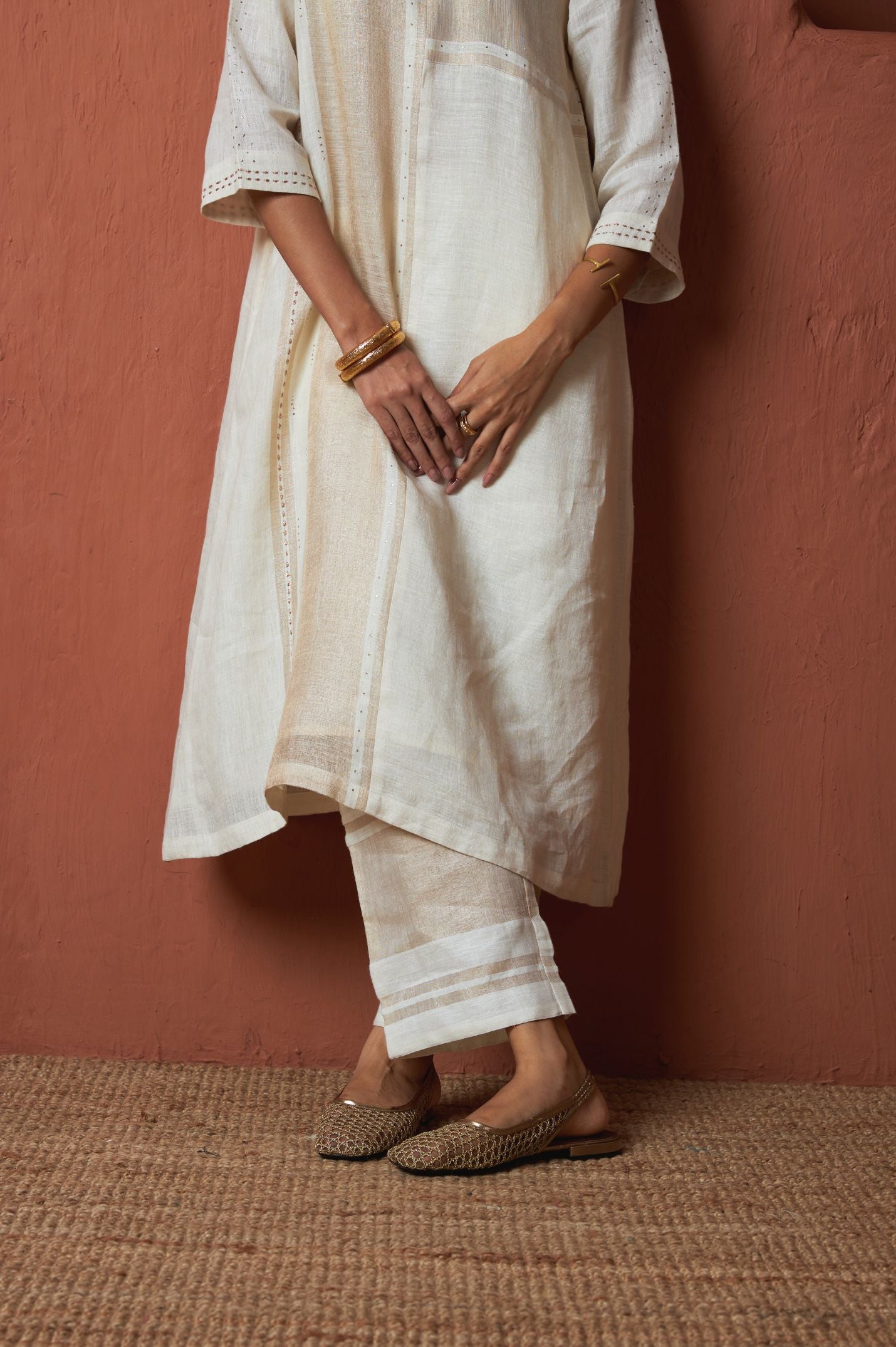This Blush Pink Woven Copper Zari Linen Co-ord from our Jashn collection is a study in quiet sophistication, defined by thoughtfully curated zari placements and detailed sleeves. A piece that breathes softness, ease, and artisanal charm in every movement.